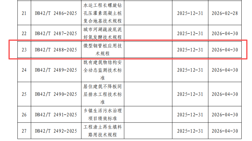 12月31日,由湖北工建牵头起草,三公司、武汉理工大学等单位共同参编的湖北省地方标准《微型钢管桩应用技术规程》(以下简称《规程》),经省市场监督管理局批准正式发布,将于2026年4月30日起实施。